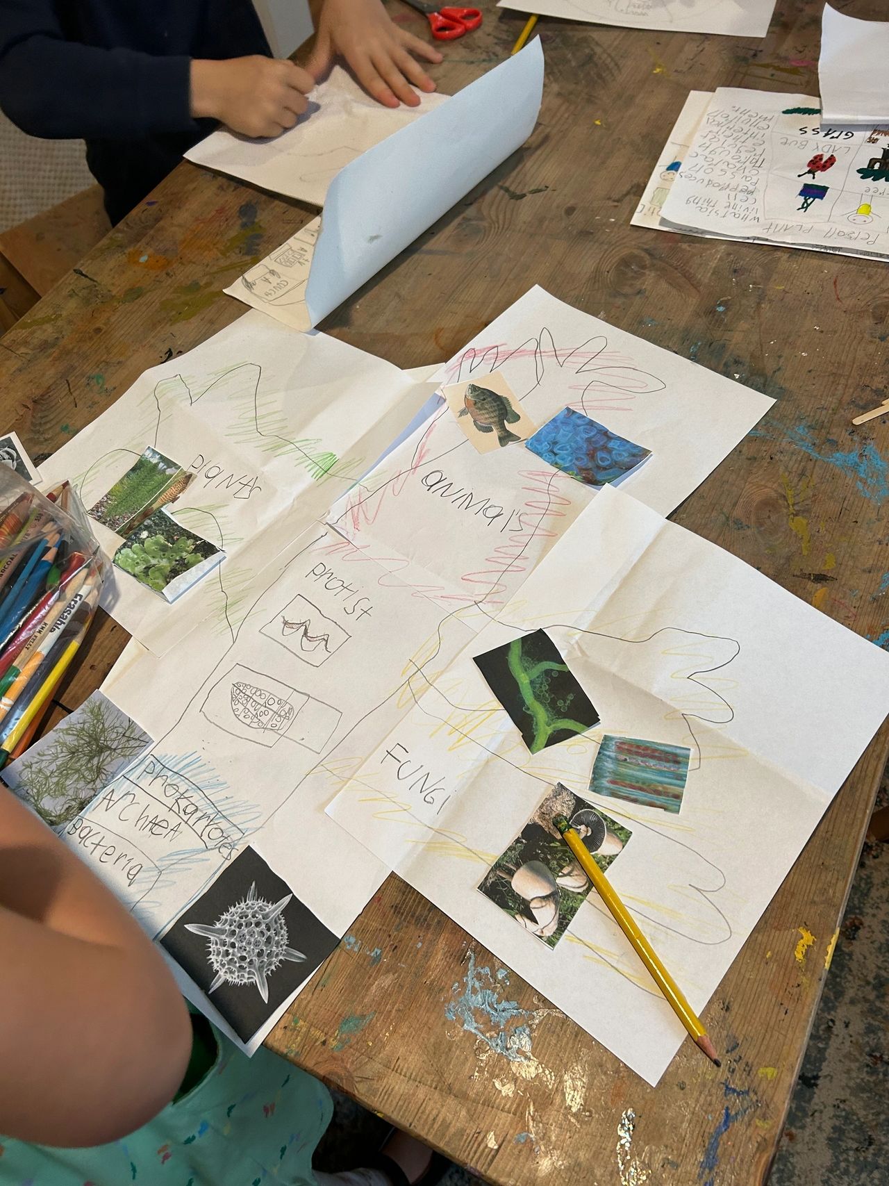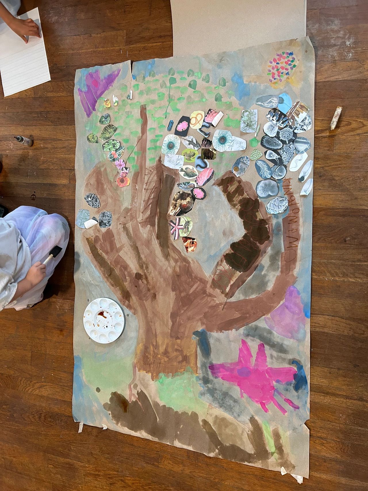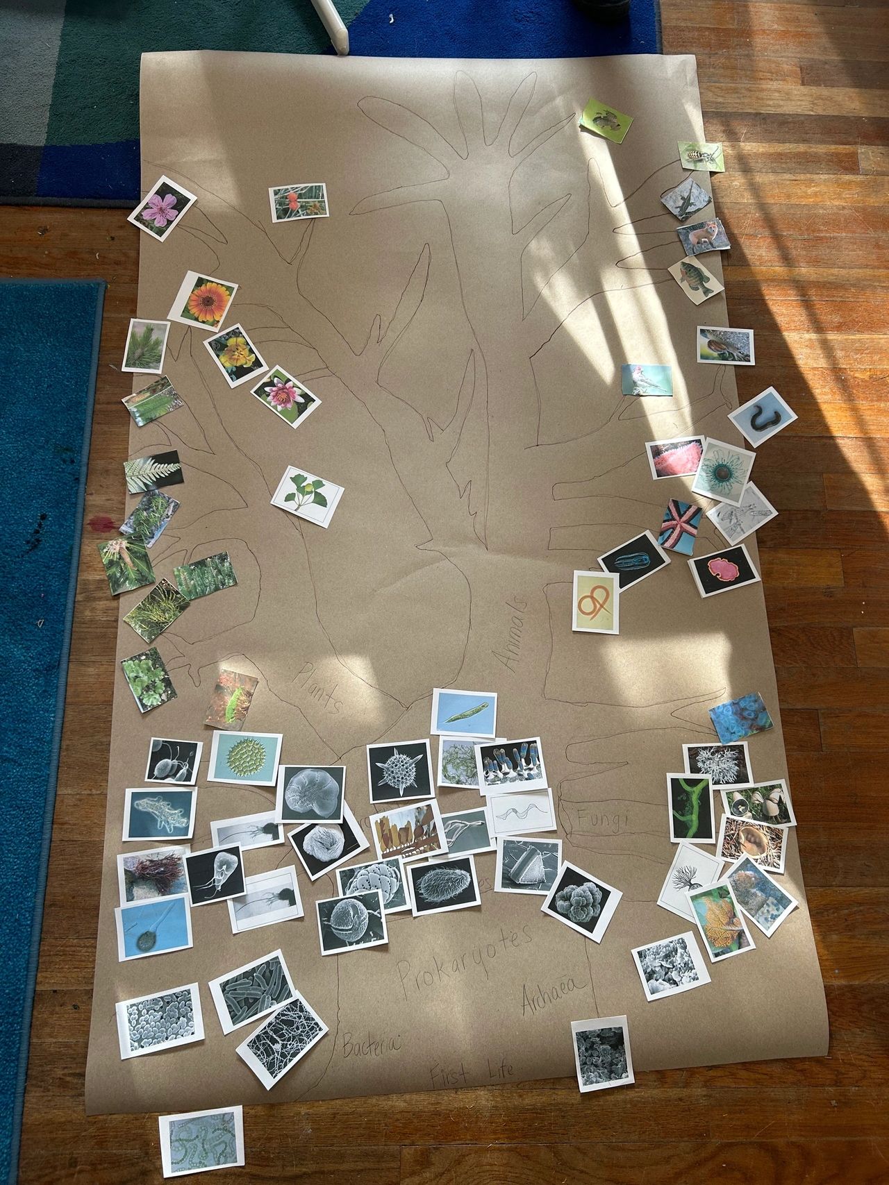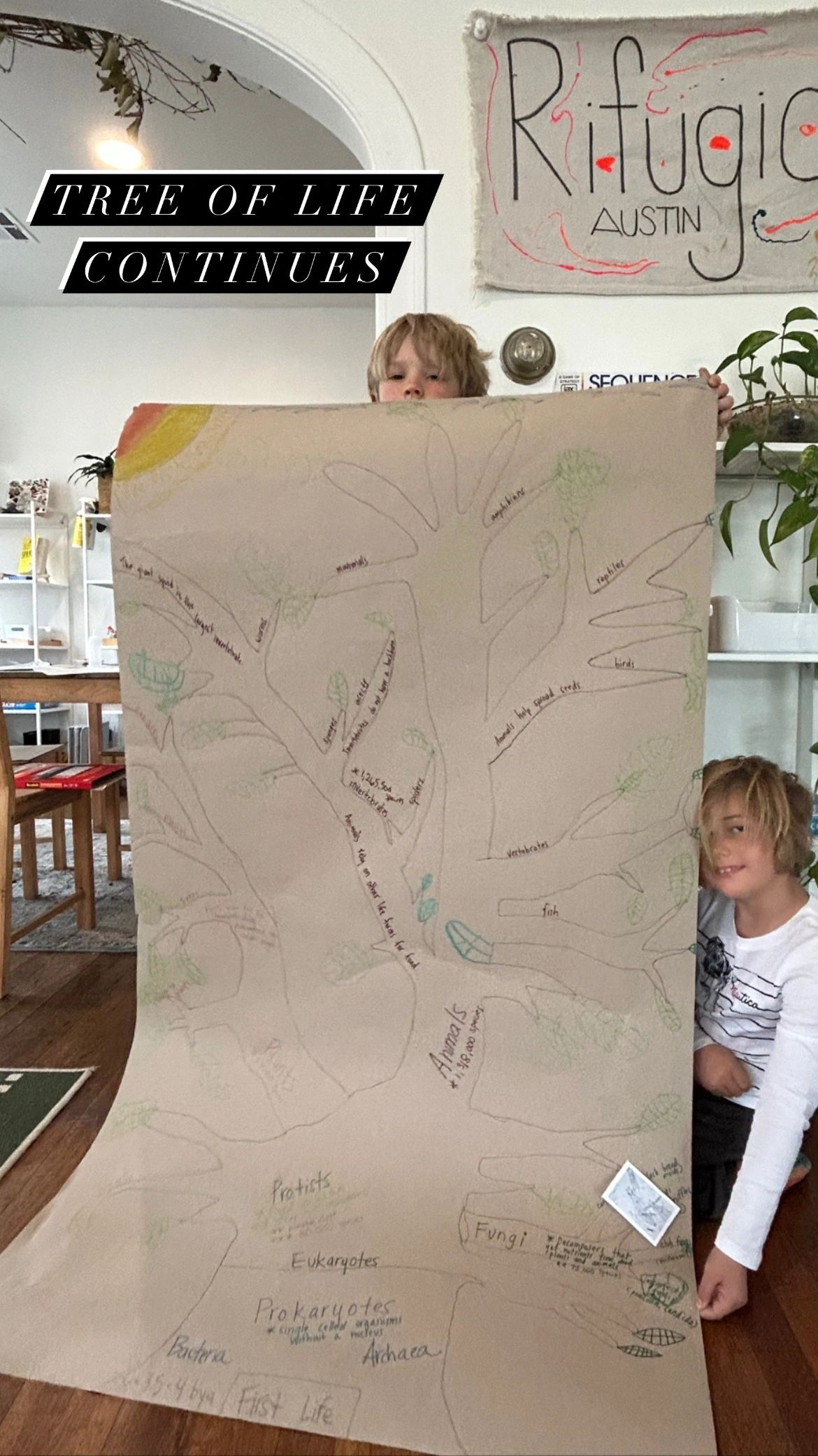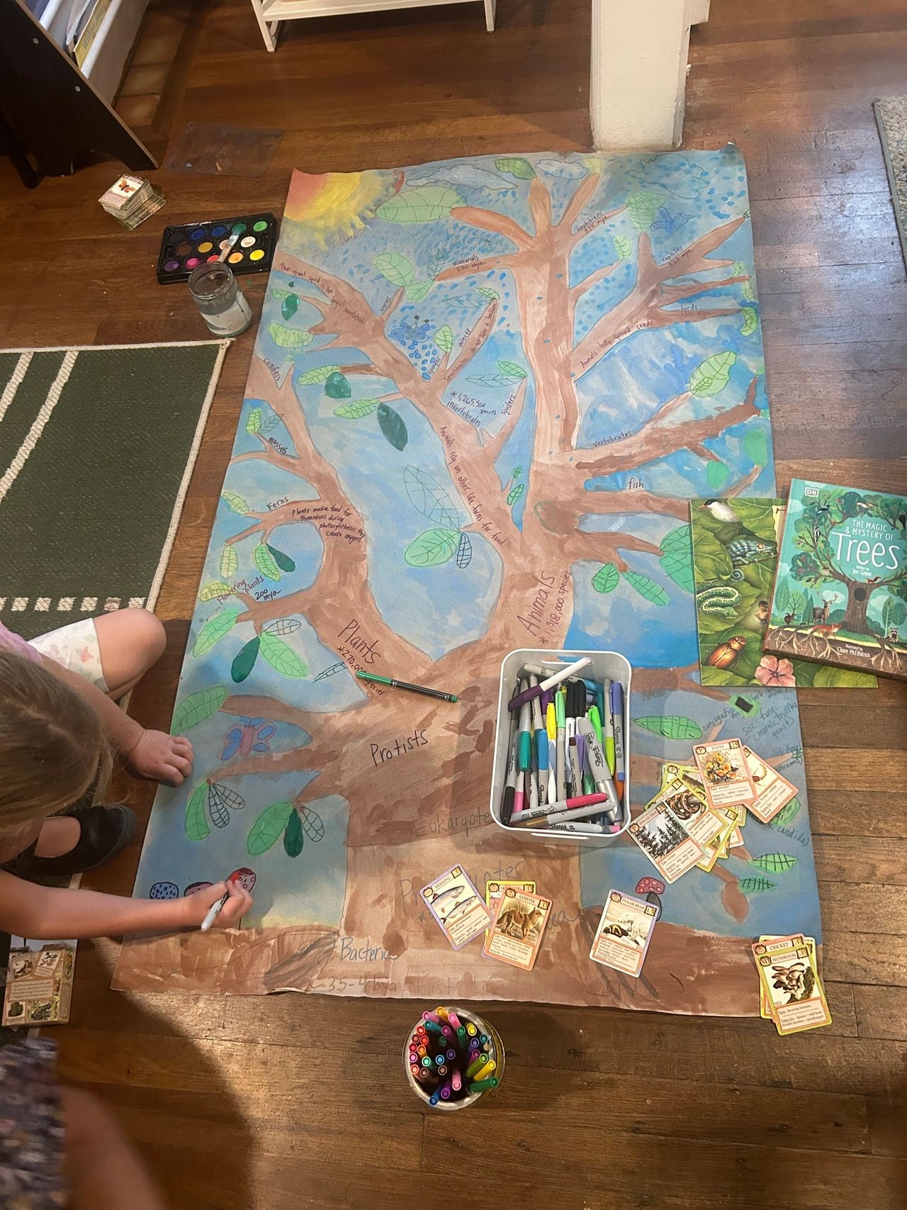 Our students started their exploration by exploring the meaning of the Tree of Life, which is a breakdown of all kingdoms of life. This initial investigation, inspired the 1st and 2nd graders to take on a group project of creating a Tree of Life for the school to use as a resource. Eira, Evelyn, Maisie, Wilder, and Marek all shared ideas of the project’s vision and agreed upon using watercolor as their main medium and sharpie to outline the details. To make the piece interactive, they added magnet tape to the tree and to the different classification images.